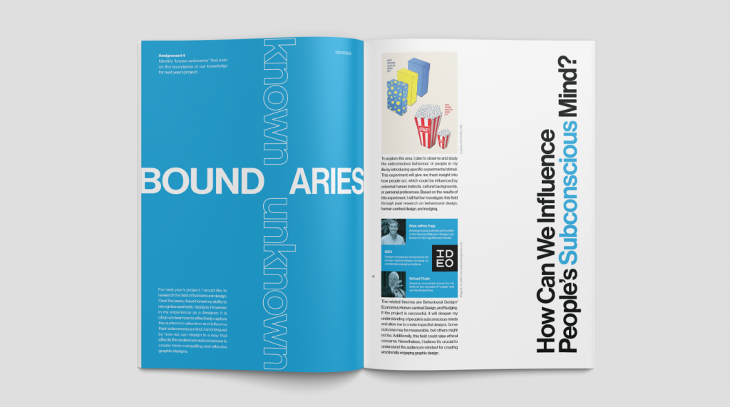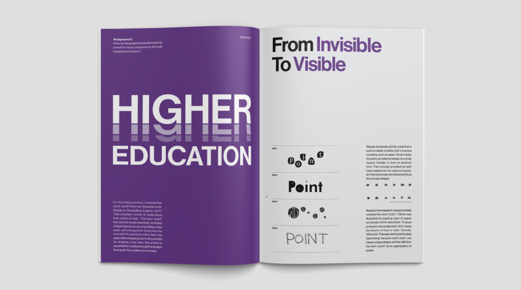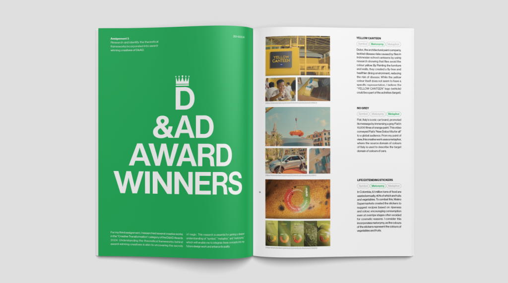 Term One includes five assignments (Assignments 0–4). I created a reflective journal to document my process and learning throughout the term. Each assignment is represented with a unique colour to visually distinguish it within the journal. Additionally, I designed each title using visual metaphors that reflect the theme of the assignments, aiming to make the content more engaging. To maintain the reader’s attention from beginning to end, I also included additional content that reflects on my learning journey beyond the assignments.