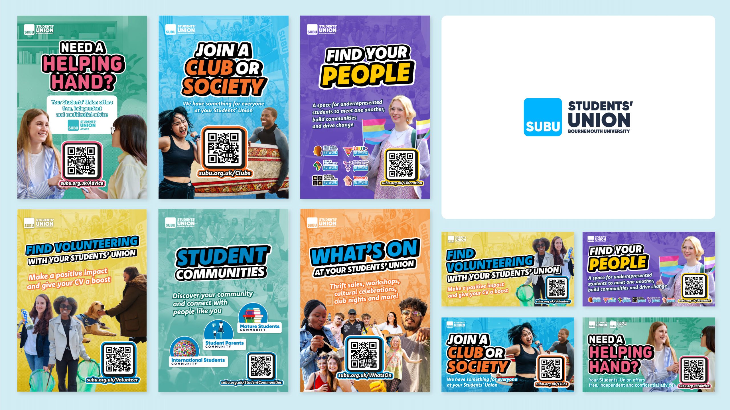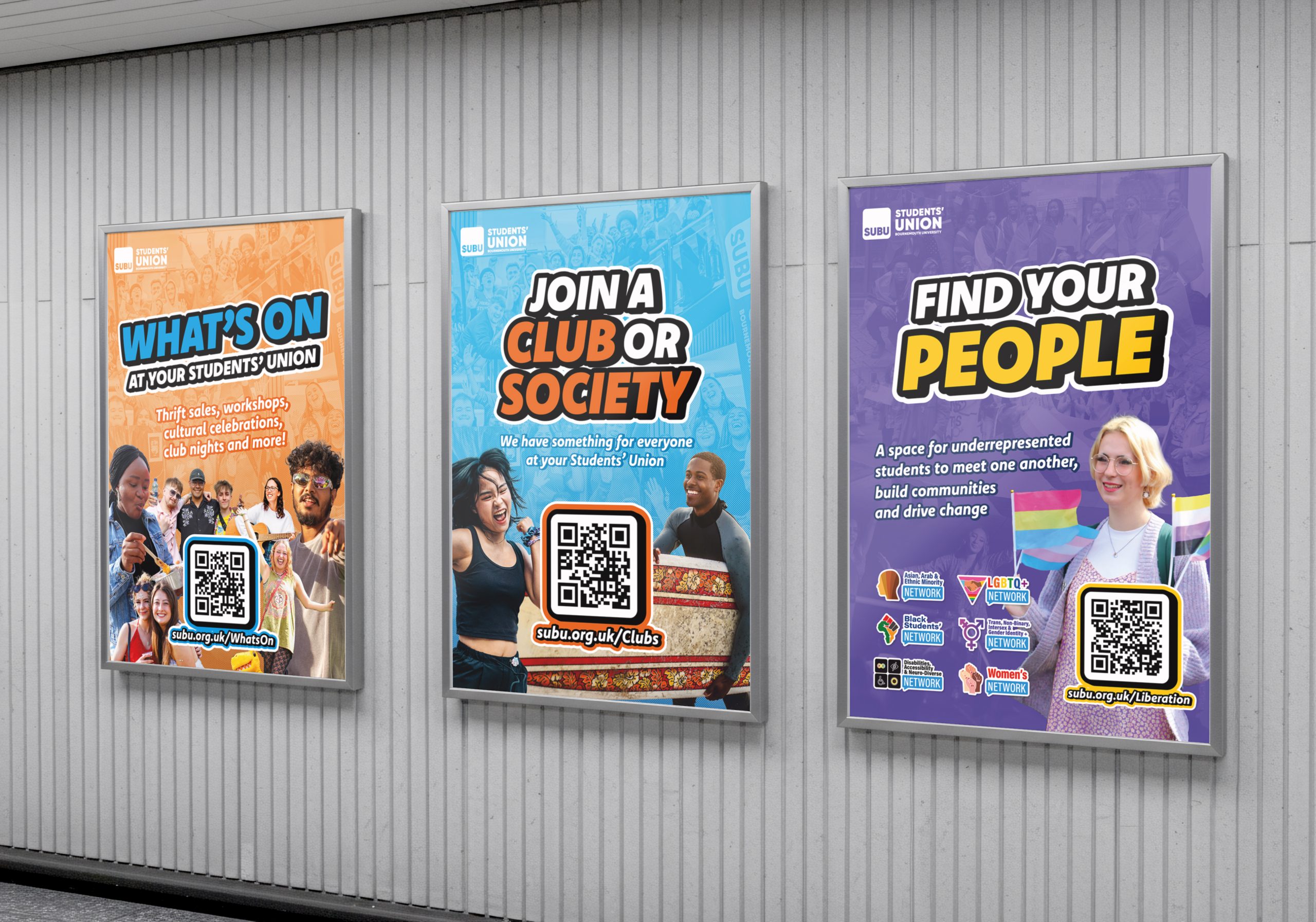 The Student Union at Bournemouth University (SUBU) supports 17,000+ students and strives to enrich their student experience. As a part of the in-house design team, I was responsible for designing logos for clubs and societies, posters, signage, and banners, aligning with the brand guidelines.